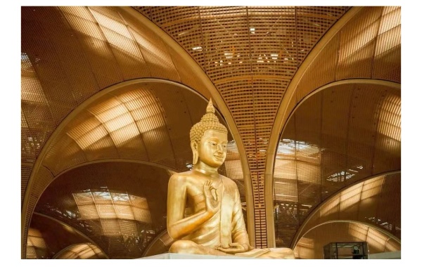机场大厅中央佛像采用合金铸造,总高9米、重达9吨,整体设计融入“数字9”这一吉祥符号,寓意吉祥美满,这尊佛像采用“佛陀赐福”造型,向国内外游客展现柬埔寨弘扬佛教的精神与形象。